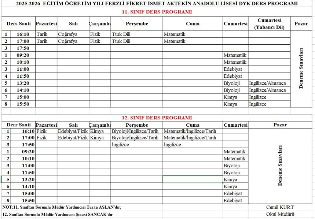 DYK Kursları Başladı. Destekleme Yetiştirme Kursları 11. Sınıf ve 12. Sınıf Ders Programı Duyurunun Ekindedir.
